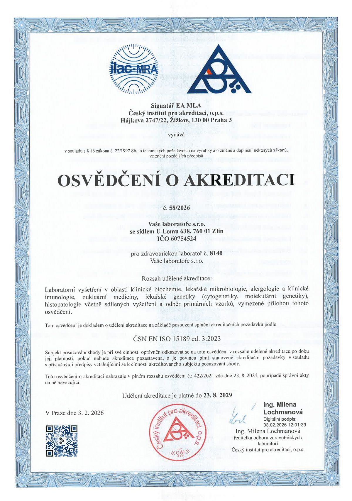 Společnost Vaše laboratoře s.r.o. je akreditovaná dle normy ČSN ISO 15189 ed.3:2023 u ČIA, o.p.s. Příloha k Osvědčení o akreditaci ČIA je k dispozici